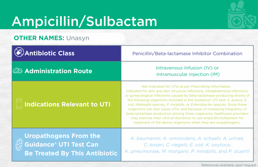 Indicated for skin and skin structure infections, intraabdominal infections, or gynecological infections caused by beta-lactamase producing strains of the following organisms included in the Guidance UTI test: Staphylococcus aureus, Escherichia coli, Klebsiella species, Proteus mirabilis, or Enterobacter species.