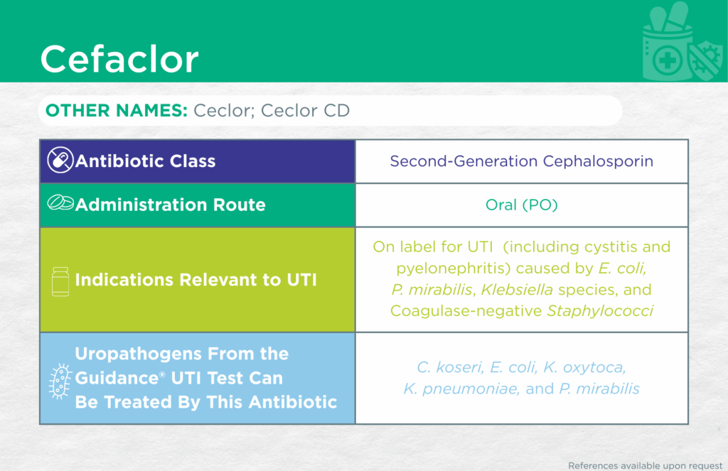 CLSI and/or FDA documents support the efficacy of this antibiotic against the following organisms from the Guidance® UTI test: Citrobacter koseri, Escherichia coli, Klebsiella oxytoca, Klebsiella pneumoniae, and Proteus mirabilis.