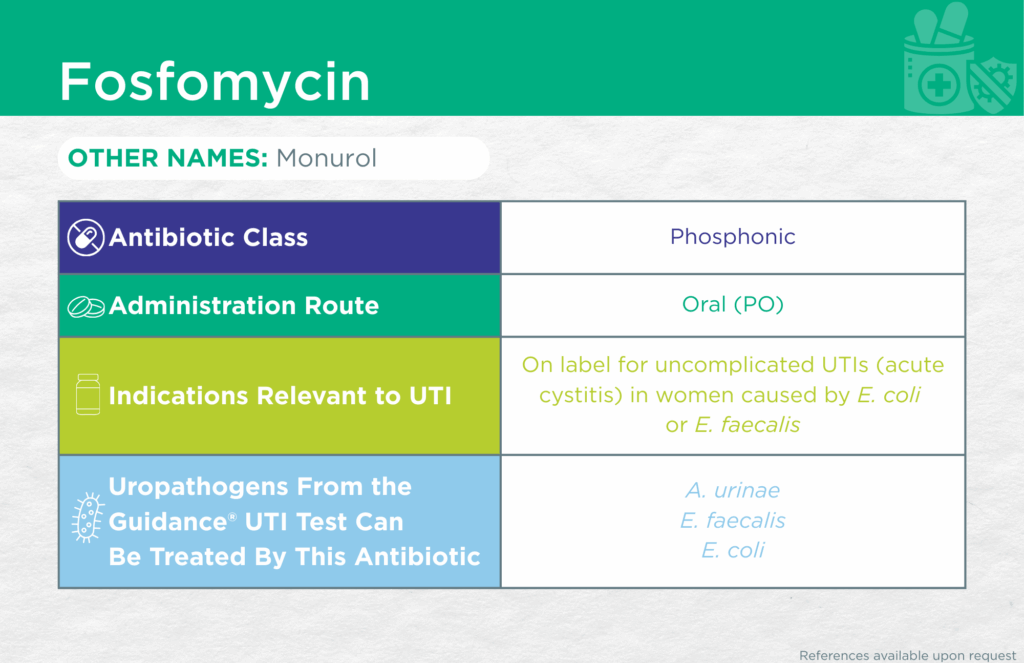 CLSI and/or FDA documents support the efficacy of this antibiotic against the following organisms from the Guidance® UTI test: Aerococcus urinae, Escherichia coli, and Enterococcus faecalis.